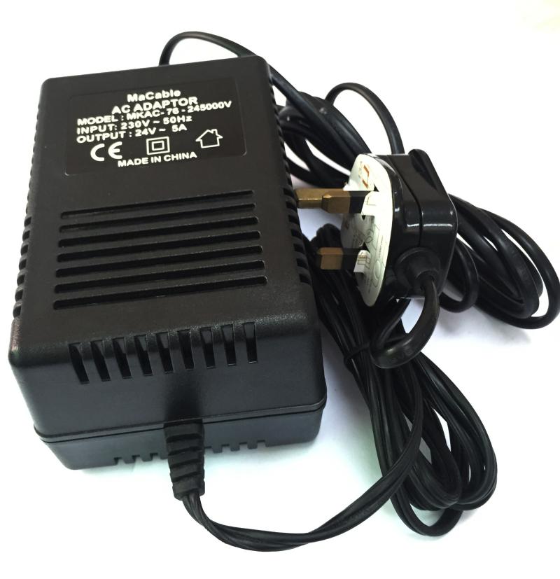 აღწერილობა: კვების ადაპტერი (AC 24 V 5 A).გამომავალი ძაბვა (Output): AC 24 V (ცვლადი დენი).გამომავალი დენი: 5 A.მონტაჟის ტიპი: მაგიდაზე დასადგამი (Desktop).შესაერთებელი (Input): ბრიტანული სტანდარტის ჩანგალი (British Standard Plug).გამომავალი ინტერფეისი: ორწვერიანი კაბელი (Two wire).